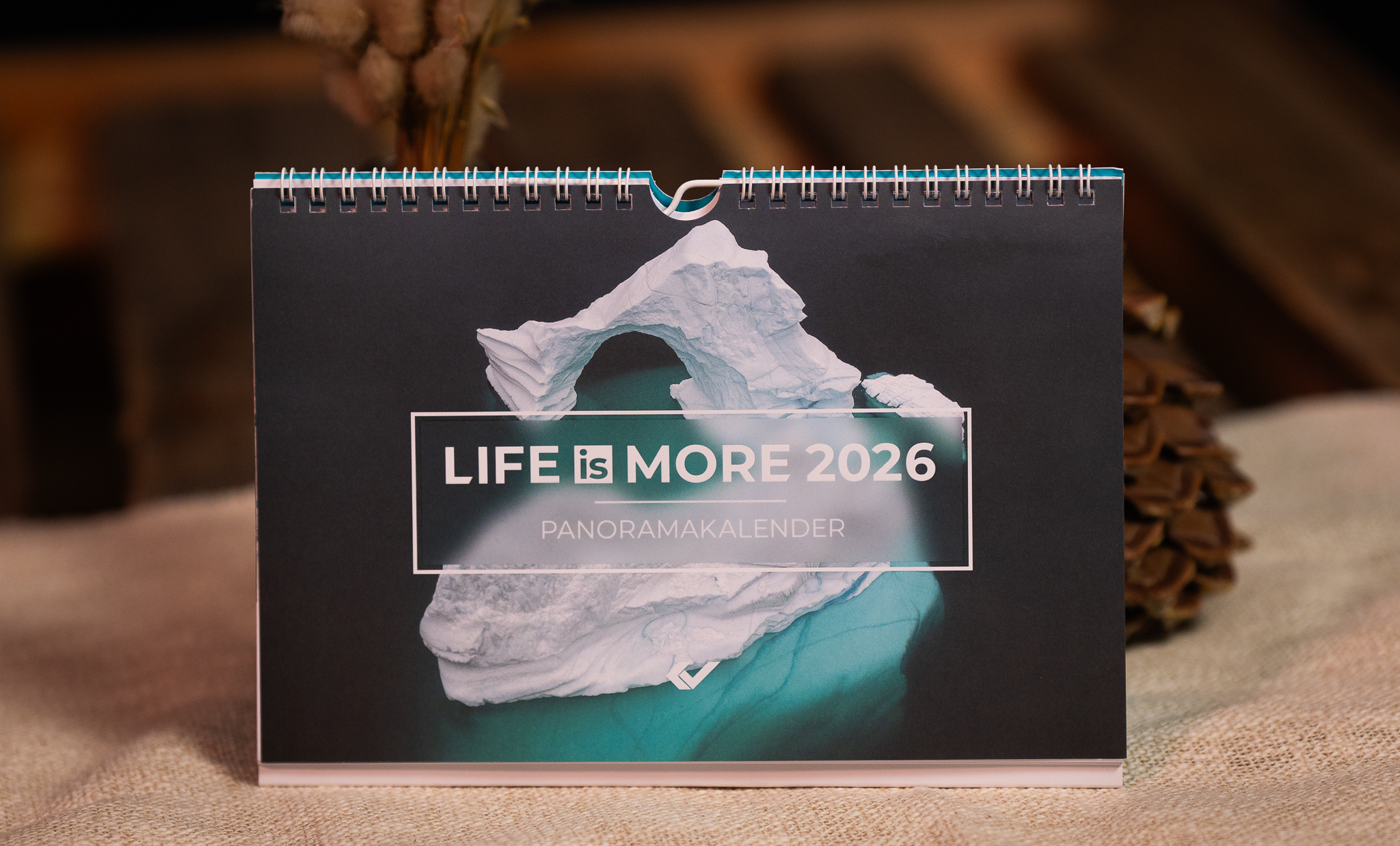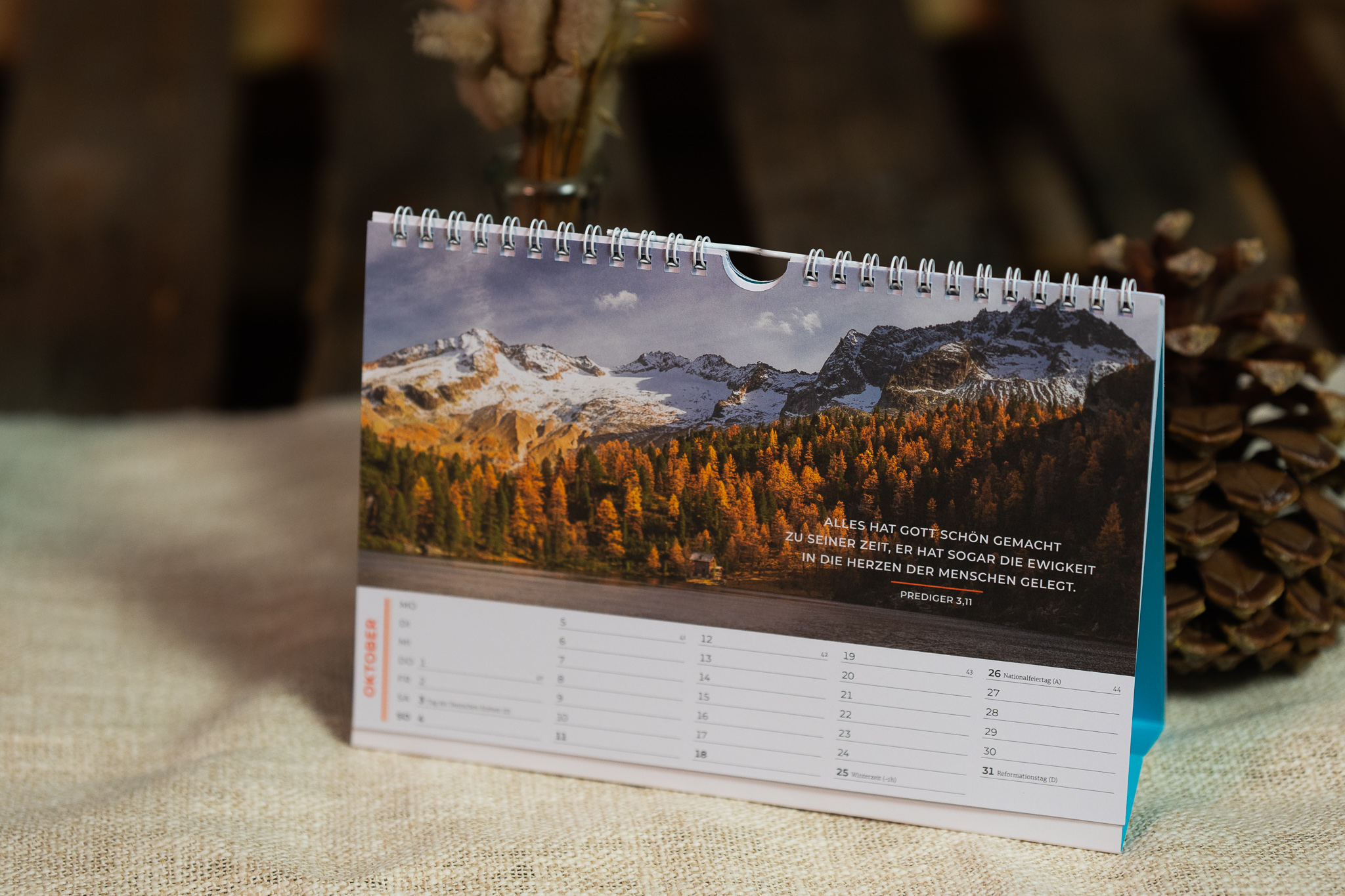 Der farbige Kalender hat jeden Monat ein schönes Bild mit einem Bibelvers.